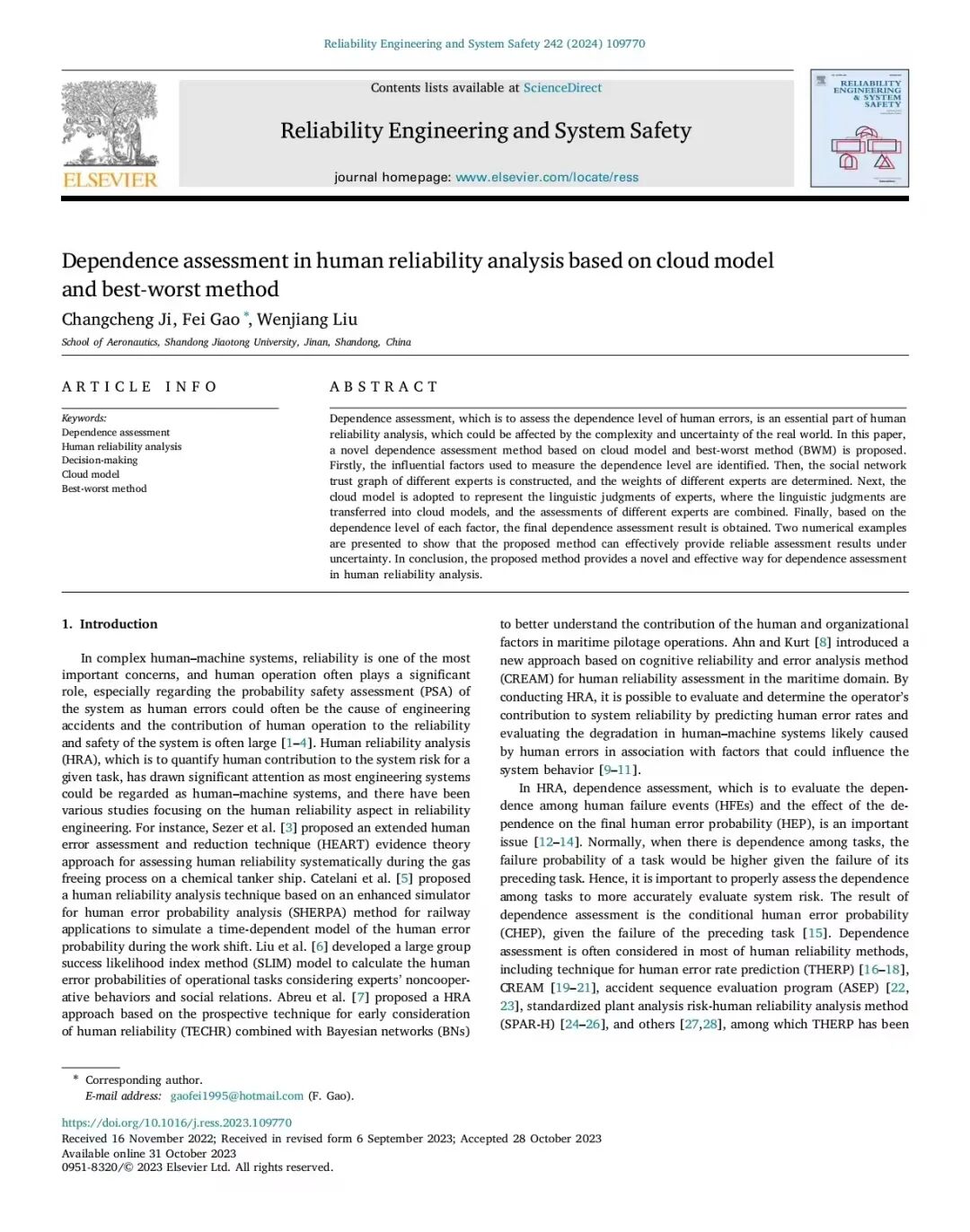 近日,可靠性领域著名国际期刊《Reliability Engineering and System Safety》(RESS)刊登了我校航空学院测控技术与仪器专业学生姬长诚发表的题为“Dependence assessment in human reliability analysis based on cloud model and best-worst method”的学术论文,