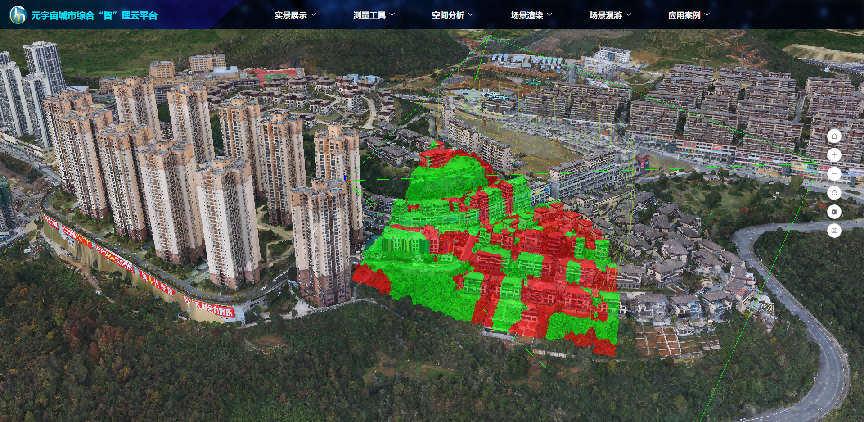 空间分析主要通过空间数据和空间模型的联合分析来挖掘出空间目标的潜在信息。其中距离、方位、拓扑关系组成了空间目标的空间关系,可以作为数据组织、查询、分析和推理的基础。系统主要实现了视域分析、日照分析及淹没分析等功能。以视域分析为例,主要实现原理为:点击事件-鼠标移动事件,显示创建一个格网以及锥体,对相机视野中的空间区域做阴影贴图,最后做属性绑定。视域分析效果如下图: