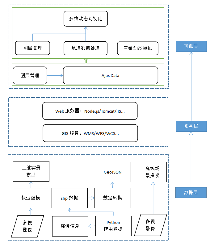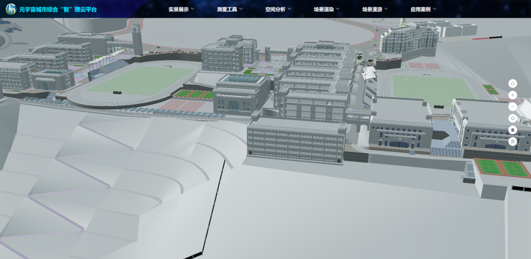 系统该设计目的是打破不同格式数据需不同软件打开的窘境及各专业数据不能及时共享的困境,实现在线浏览各类三维模数字模型,同时能够对建筑模型信息、POI数据等信息进行查询。系统主要包括实景展示、测量工具、空间分析、场景渲染、场景漫游等主要功能。