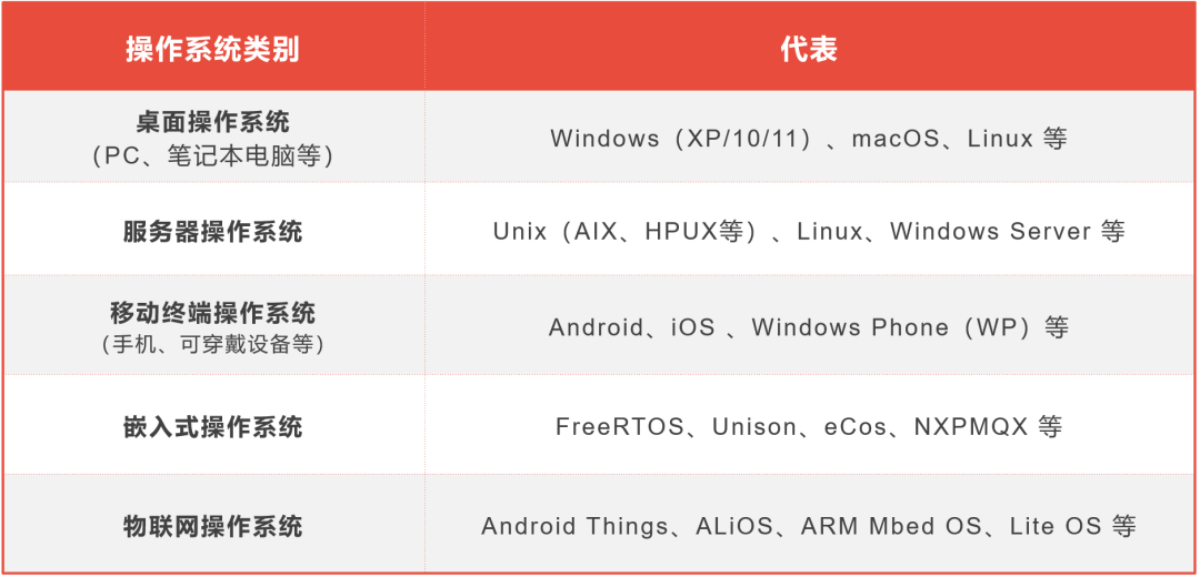 通常来说,操作系统大致可以分为桌面操作系统、服务器操作系统、移动终端操作系统、嵌入式操作系统、物联网操作系统等类别。