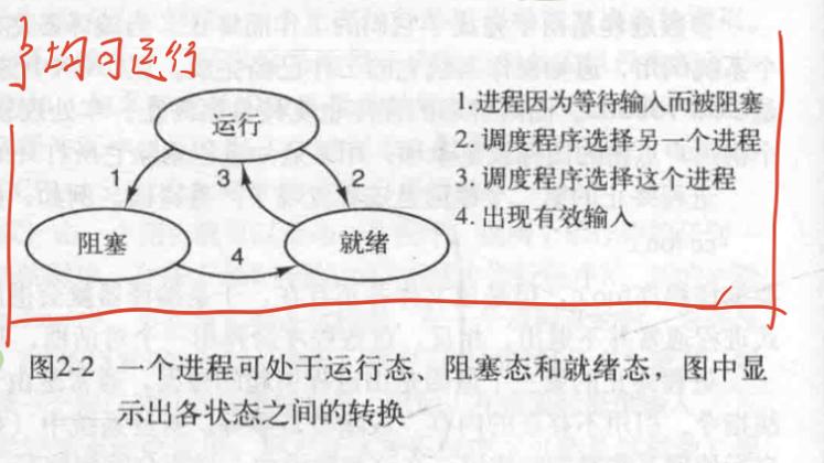 1.运行态(此时程序正在使用CPU) 2.就绪态(可运行,但是没有CPU使用权) 3.阻塞态(除非某种外部事件发生(比如输入流到达),否则进程不能运行)