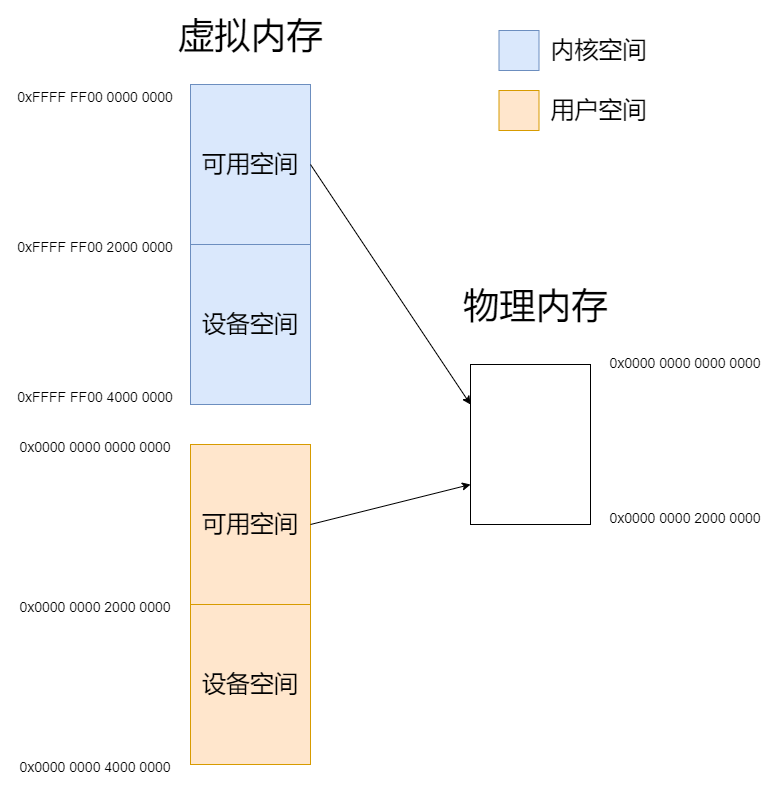 用户空间的内存映射是在boot阶段初始化(boot/mmu.c中的init_boot_pt函数)。内核空间的内存映射一部分是在boot阶段初始化的:可用空间0xFFFF FF00 0000 0000 ~ 0xFFFF FF00 1000 0000和设备空间0xFFFF FF00 2000 0000 ~ 0xFFFF FF00 4000 0000。未初始化的部分放的是伙伴系统,而伙伴系统则是boot之后进入内核后初始化,通过map_kernel_space函数将0xFFFF FF00 1000 0000 ~ 0xFFFF FF00 2000 0000映射到物理空间。