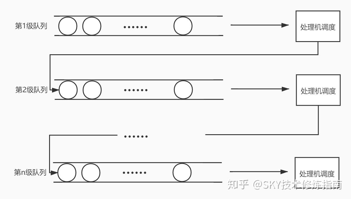 多级反馈队列调度算法是这些调度算法中最复杂的,也是整合了前面一些调度算法而形成的算法,我们来看一下它的工作过程。