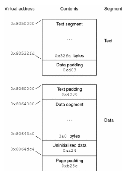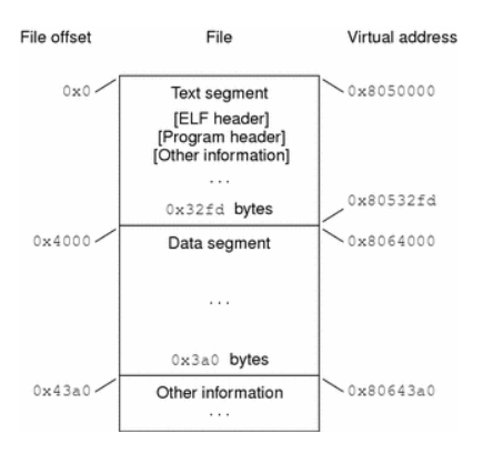 程序头表是告诉操作系统如何加载可执行文件到内存,一般是逻辑上将对应segment复制到虚拟内存,等真正执行的时候在通过缺页中断加载进物理内存。对于程序一般来说有两个segment,text segment(只读的指令和数据)和data segment(可读写的数据和指令)。以下图片展示了segment与虚拟内存的映射[3]: