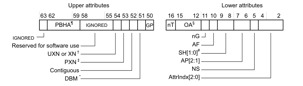 仔细看了页表项的union pte的设计,发现l2 block和l1 block的页表属性是一样的布局,但是l3 page在GP之后就和l2 block不同了。但是查看ARM手册之后,我发现无论是page还是block,它们的页表属性都应该是一样的布局[4]: