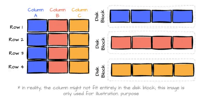 例如,想象一个有50列和数百万行的表。如果只对其中的3列感兴趣,行式格式需要读取每一行的全部50列。