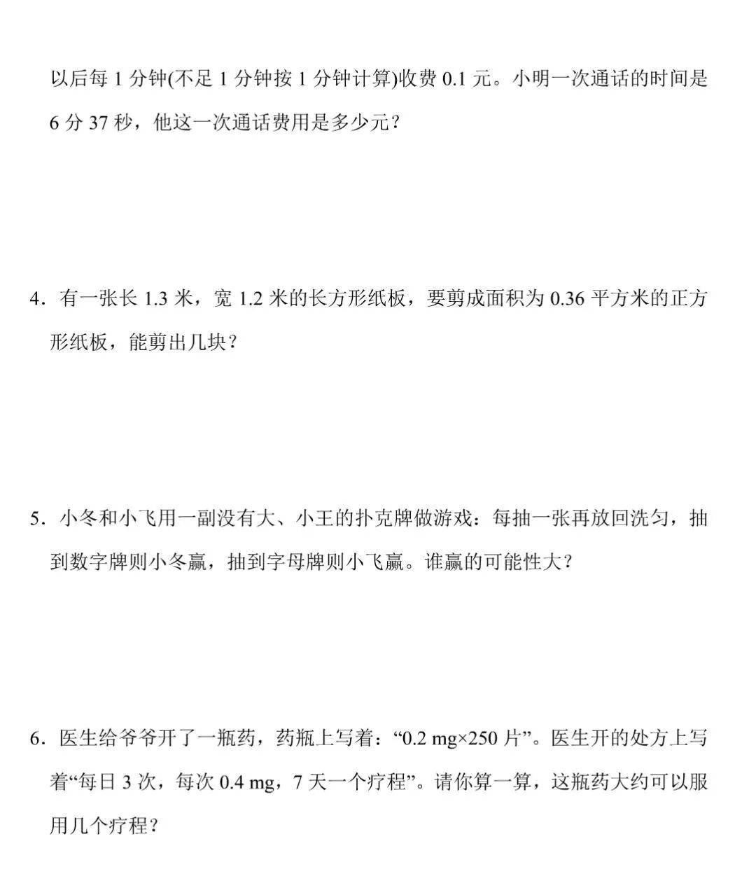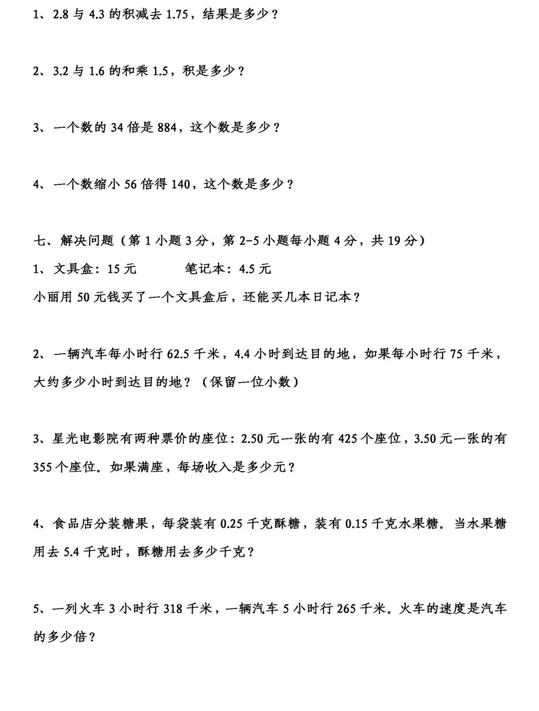 七、解决问题(第1小题3分,第2-5小题每小题4分,共19分)