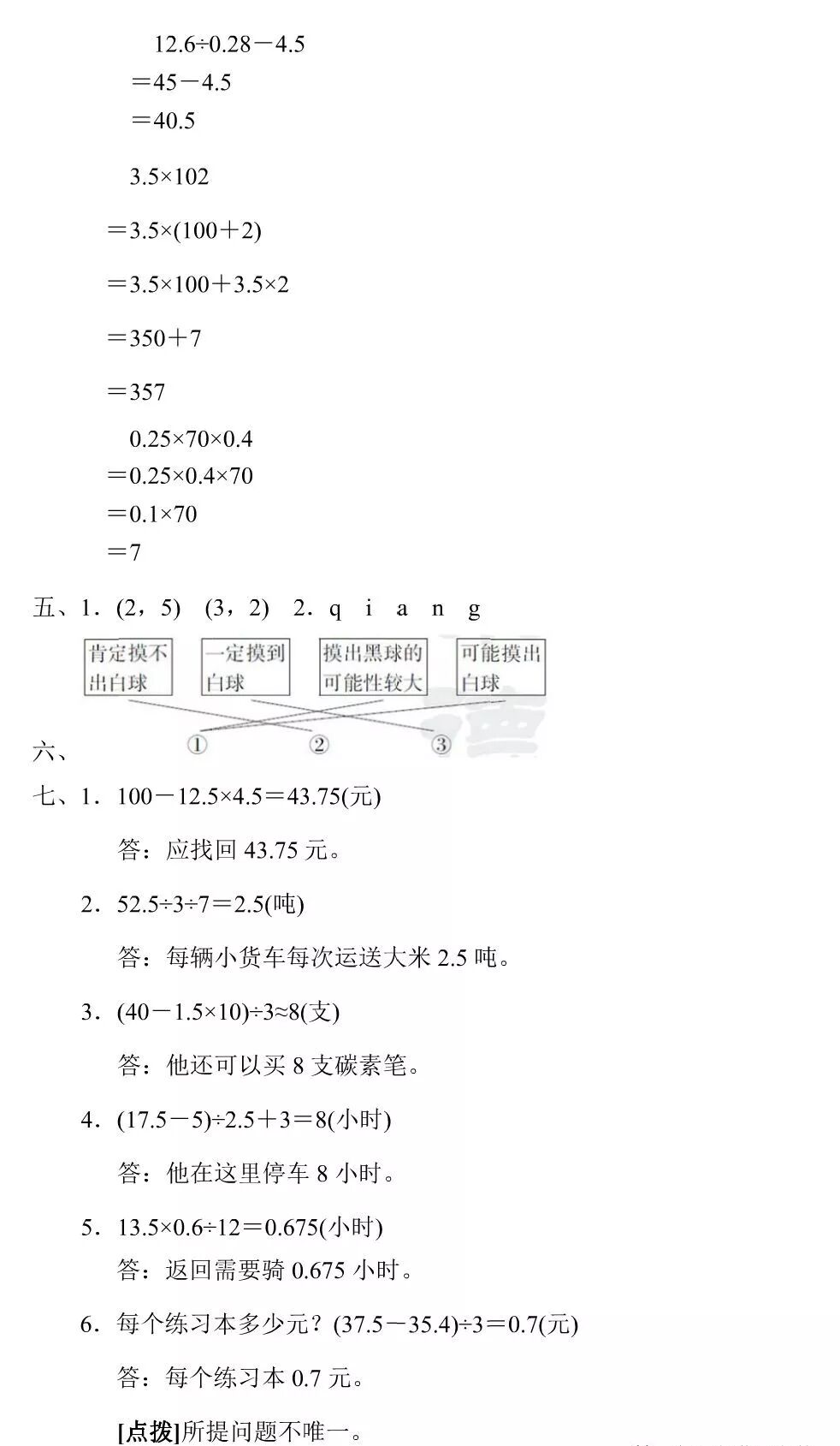 7、盒子里有6个白球,4个黄球,任意摸一个球,摸到白球的可能性是( 0.6 ),摸到黄球的可能性是( 0.4 )。