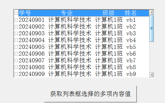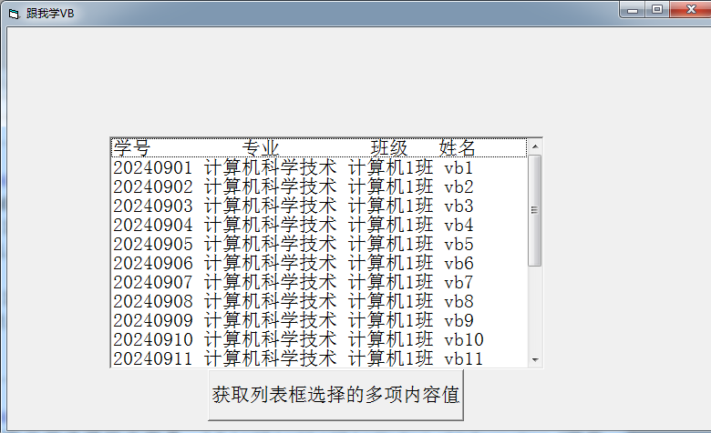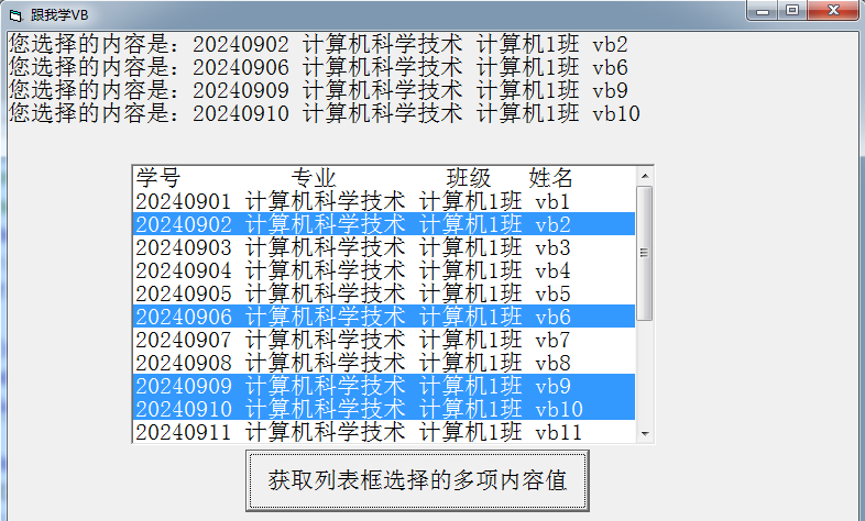 Private Sub Command1_Click() ‘获取列边框多选内容For i = 1 To List1.ListCount - 1If List1.Selected(i) = True ThenPrint “您选择的内容是:” & List1.List(i)End IfNextEnd SubPrivate Sub Form_Load() ‘初始化列表框内容,通过for循环向列表框中动态添加内容List1.AddItem “学号 专业 班级 姓名 “For i = 1 To 20List1.AddItem & Format(i, “00”) & ” 计算机科学技术” & ” 计算机1班 “ & “vb” & iNextEnd Sub