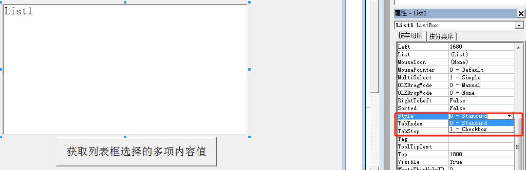 Tips:Style属性设置为1后,MultiSelect属性值VB会自动置为0 。不信?那你就实际动手验证下!