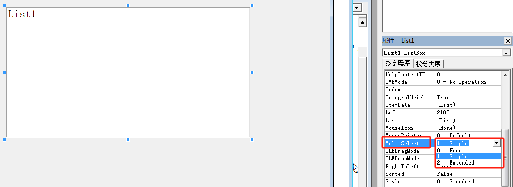 1:表示简单多重选定,用户用鼠标单击或按Space键来选取多重列表项,但一次只能增减一个项目。 -
