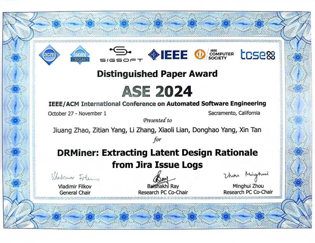 近日,第39届IEEE/ACM自动化软件工程国际会议(IEEE/ACM International Conference on Automated Software Engineering,简称ASE)在美国萨克拉门托召开,ASE是CCF-A类国际学术会议之一,也是软件工程领域的三大顶级会议之一。北京航空航天大学计算机学院张莉教授团队共有4篇论文被录用,其中题为《DRMiner:Extracting Latent Design Rationale from Jira Issue Logs》的论文荣获IEEE/ACM SIGSOFT Distinguished Paper Award。论文作者为计算机学院21级硕士生赵久昂、软件学院22级博士生杨子天、计算机学院教授张莉、计算机学院助理研究员连小利、计算机学院23级硕士生杨东浩、计算机学院助理教授谭鑫。这也是今年以来连小利老师作为第一作者或通讯作者在顶级国际学术会议中获得的第二个杰出论文奖。