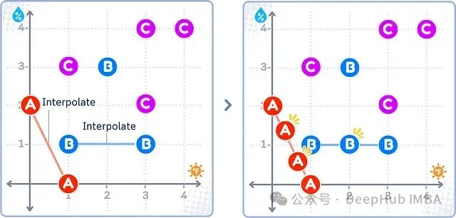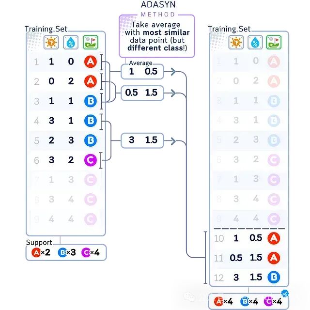 如上图所示,ADASYN重点在少数类(A)邻近多数类(B和C)的”困难区域”附近生成新的合成样本。对于多数类,其新样本也是在类似区域生成。