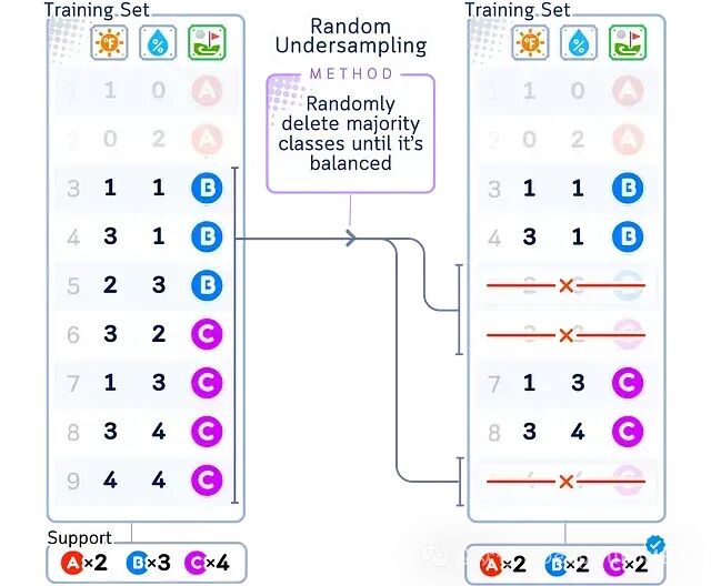 如上图所示,随机欠采样会随机选择多数类(B和C)中的部分样本予以删除,而少数类(A)的样本保持不变。