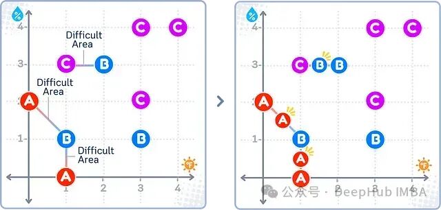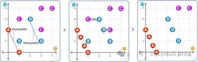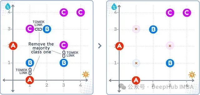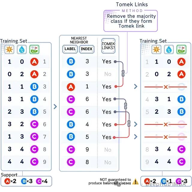 如上图所示,Tomek Links方法识别出不同类别(如A-B、B-C)之间的最近邻样本对,并删除这些样本对中来自多数类(B、C)的样本,而少数类(A)的样本全部保留。