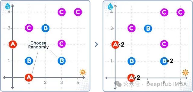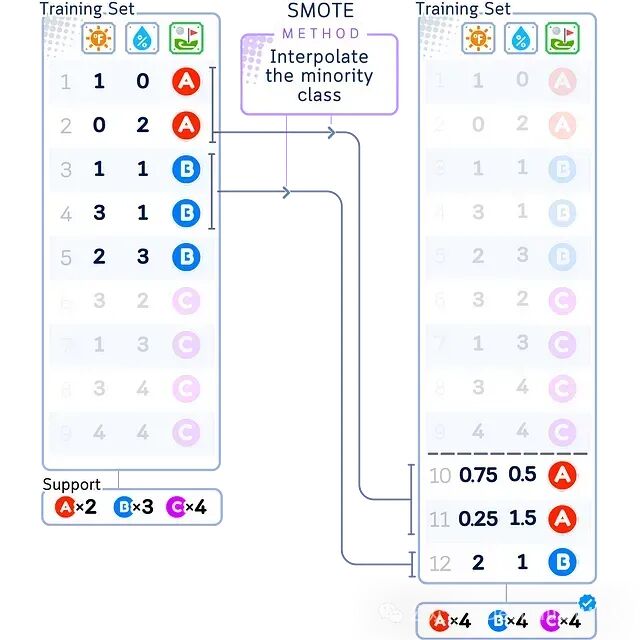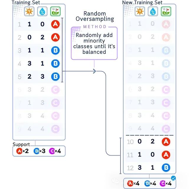 如上图所示,随机过采样会对少数类(A)中的样本进行随机复制(图中标记为A×2),而多数类(B和C)的样本保持不变。