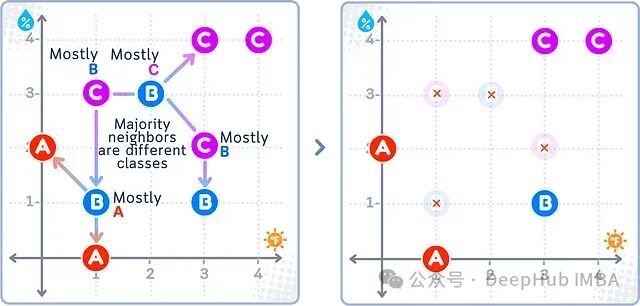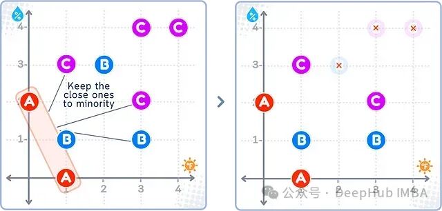 在上图所示的ENN欠采样结果中,右图中那些被红叉标记的多数类(B、C)样本被删除,因为它们的大部分邻居来自其他类别。