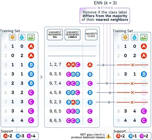ENN(Edited Nearest Neighbors)通过删除被”异类”包围的样本来实现数据清洗。对多数类的每个样本,若其大部分最近邻样本均来自其他类别,则将其视为噪声或离群点予以删除。这有助于进一步清晰化类别边界。