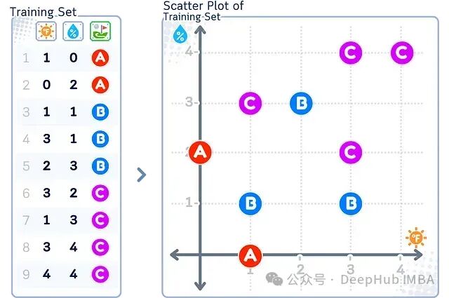 其中,每条记录包含三个字段:温度(取值范围0-3)、湿度(取值范围0-3)、高尔夫运动类型(A=标准场地,B=练习场,C=室内高尔夫)。整个训练集包含2个特征维度,共9条记录。