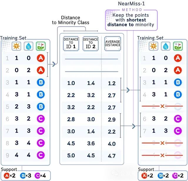 Near Miss-2:对每一个多数类样本,找出其最近的三个少数类样本,选择离这三个少数类样本平均距离最远的多数类样本保留,删除其余的多数类样本。 - Near Miss-3:对每一个多数类样本,计算其与多数类中其他样本的平均距离,选择平均距离最大的样本保留,删除其余的多数类样本。