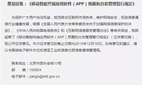 工信部起草了《移动智能终端应用软件(App)预置和分发管理暂行规定》,并公开征求意见,明确提出除基本功能软件外的手机软件,必须可卸载。一旦发现恶意APP,应及时下架。对那些‘不听话’的厂商,通信主管部门将依据职权责令改正,依法进行处罚,并将相关情况向社会公布。”