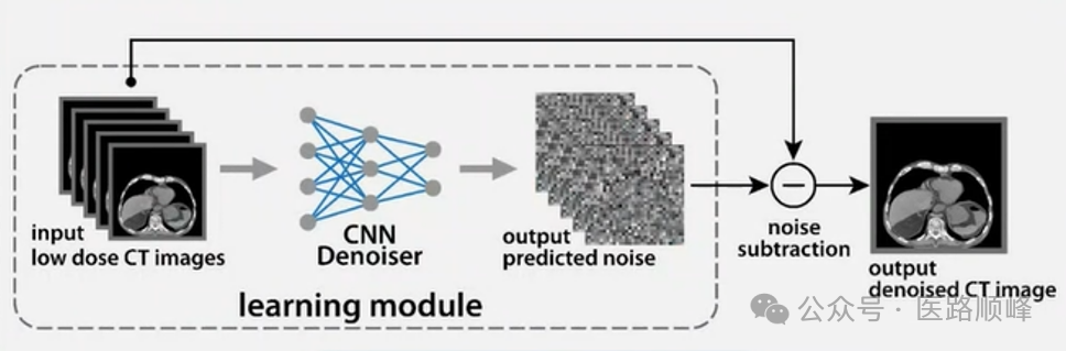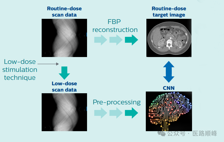 为了训练精确的Precise image图像神经网络,首选获取常规剂量扫描的具有临床诊断价值的图像数据,然后基于此,以一种精确模拟光子和电子噪声的方式模拟低剂量扫描数据,最后赋予神经网络从低剂量输入复制常规剂量图像的图像外观的任务。通过这种方式训练神经网络,使得对CT固有的各种因素(如辐射剂量、患者体型和解剖结构)具有更强的鲁棒性。