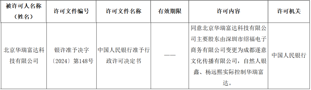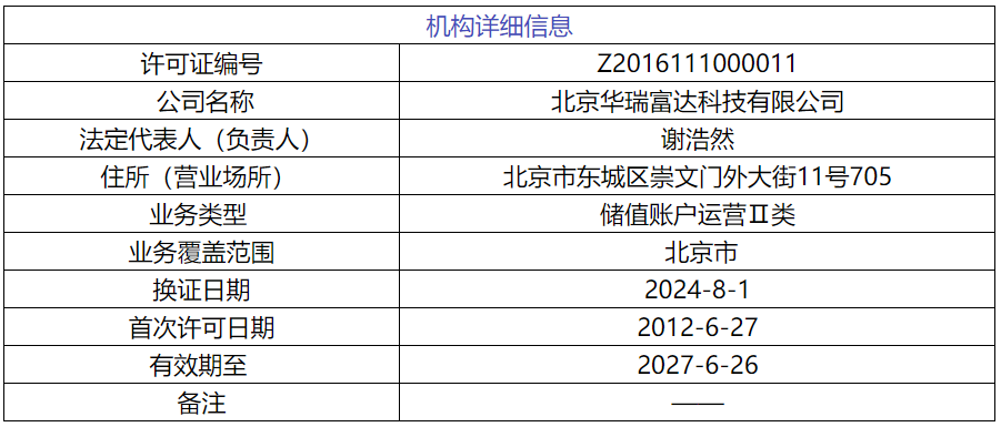 据移动支付网了解,华瑞富达成立于2007年,并于2012年获得由人民银行颁发的《支付业务许可证》,获准在北京市开展预付卡发行与受理业务。2022年6月,华瑞富达支付牌照续展成功,随着支付业务类型重新划分,其业务类型已变更为“储值账户运营Ⅱ类”。