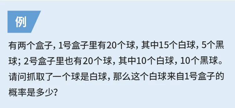 然后我们来分析一下题目,很明显题目让我们做一件事—算概率,但是有两个要求:①球得来自一号盒,②已知球是白球。我们先来解决要求①,这一步很简单,总共40个球,一号盒20个球,故P(A)=50%。