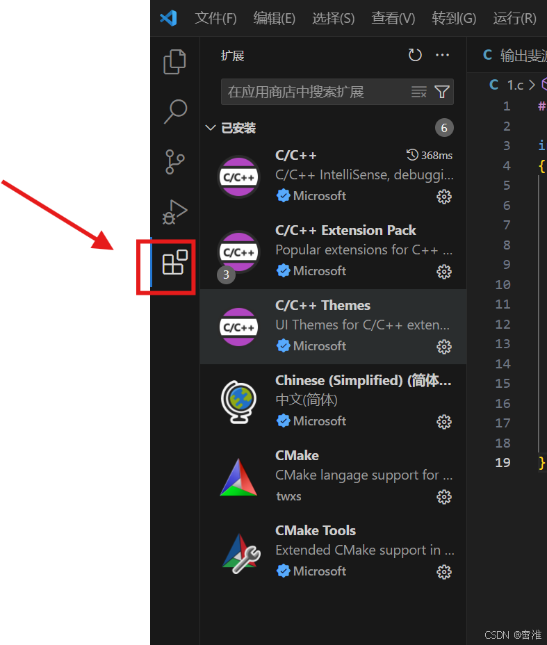 接下来配置vscode中文环境和C/C++扩展包,打开vscode,点击左侧“扩展”