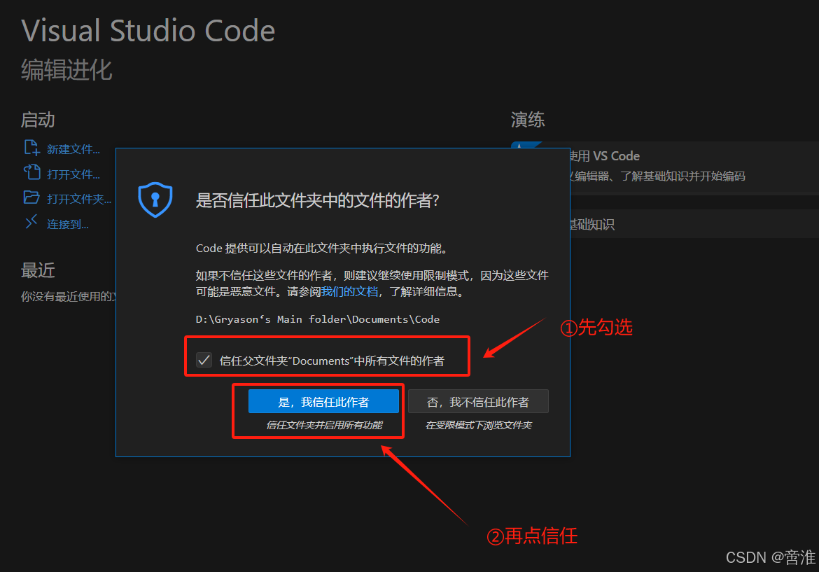 再打开vscode,点击“打开文件夹”,在弹窗中找到刚刚建立的代码文件夹并点击“选择文件夹”