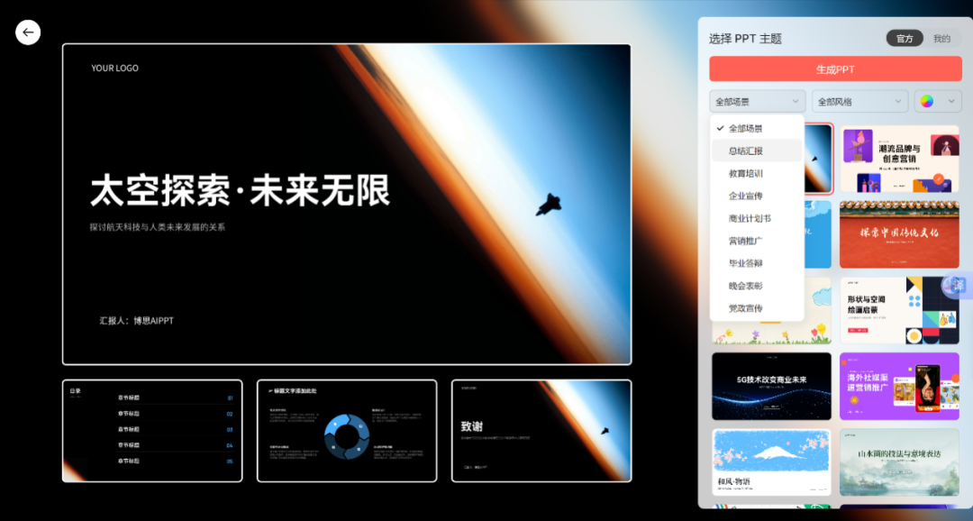 - 打开博思AIPPT官网,选取PPT应用场景、所需风格、颜色等