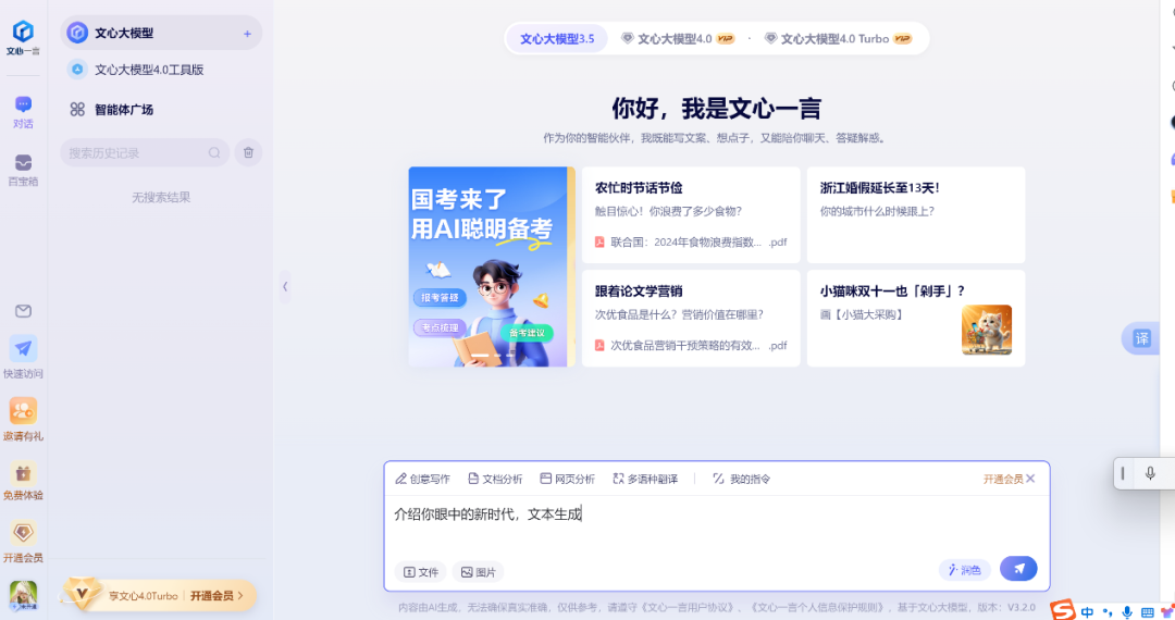 - 打开文心一言官网,输入你所需要的主题,就会自动生成海量相关内容,包括文字、图片等