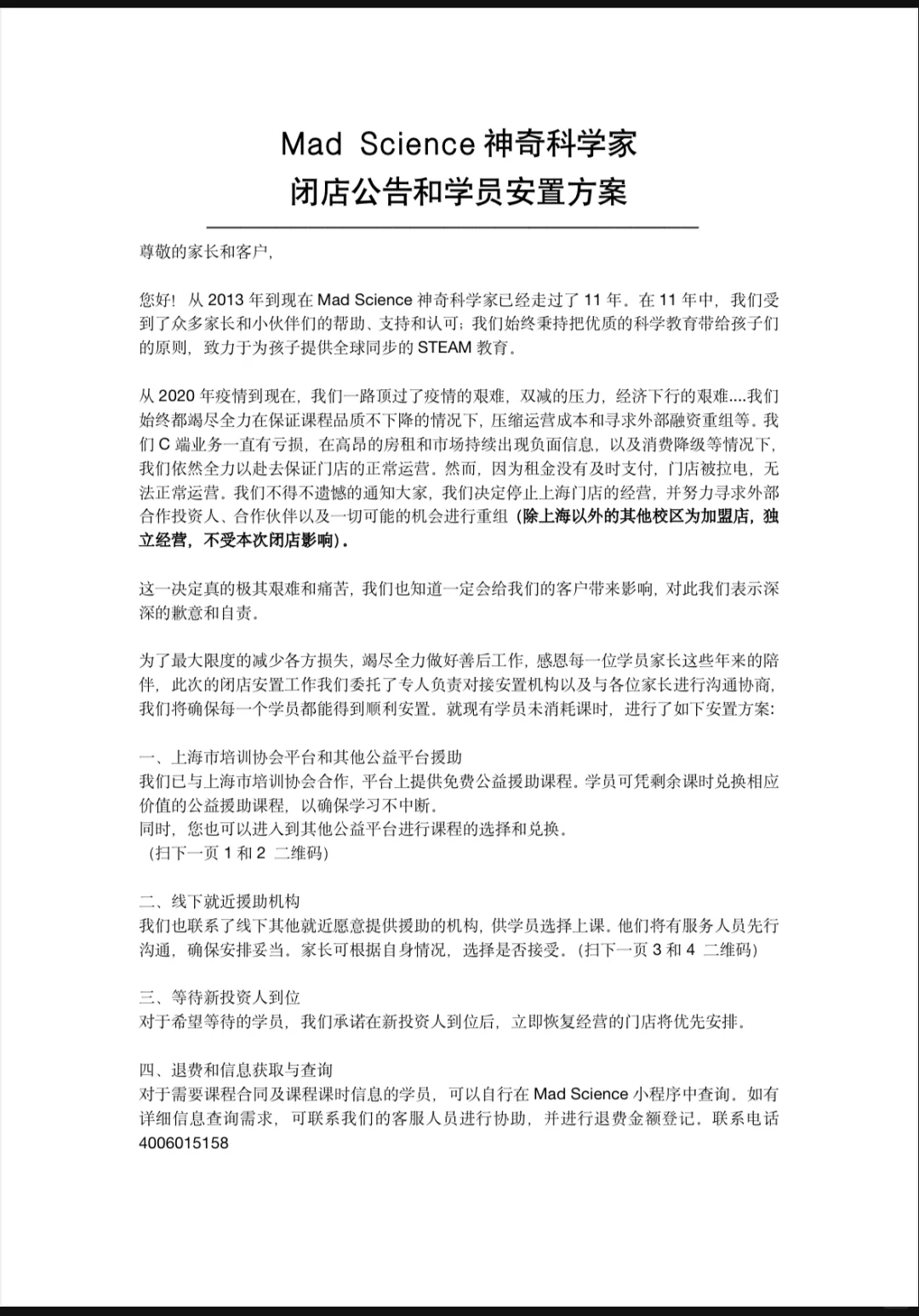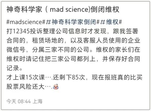 另一位记者联系到的家长表示,她在“Mad Science”已经上了3年的课了,孩子和老师的感情也很好。在闭店公告发出后,她跟老师沟通,老师表示他们提前也并不知情,工资和社保都已经断了2个月。