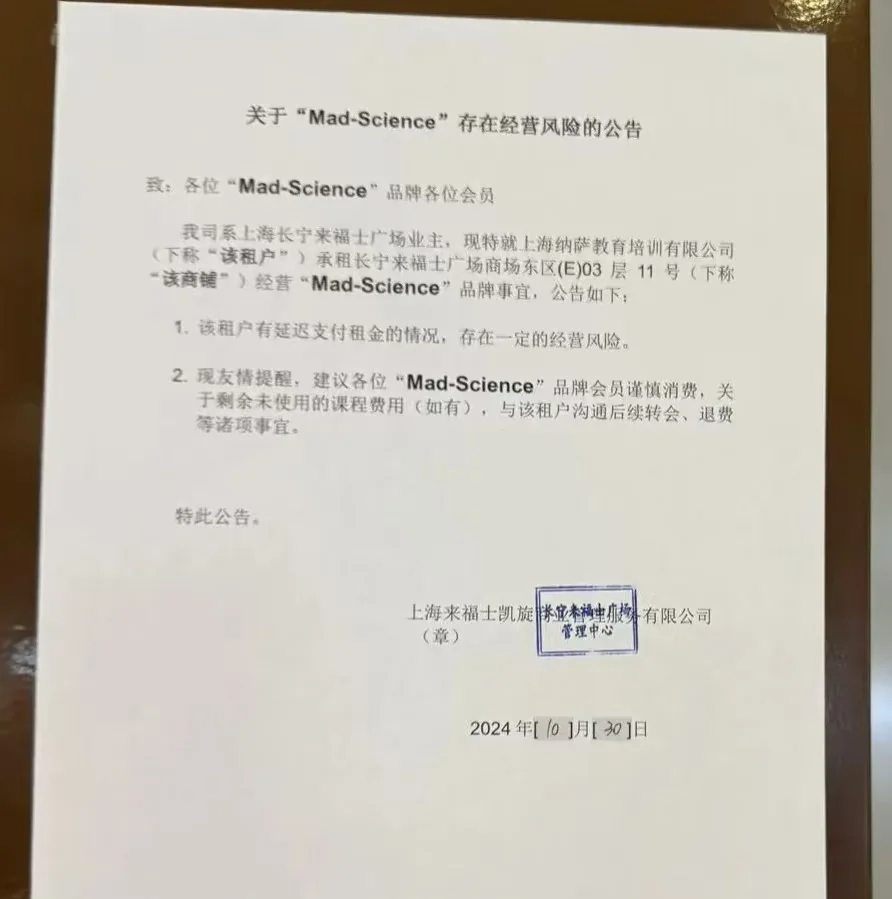 10月30日,长宁来福士广场发布公告称,“Mad-Science”有延退支付租金的情况,存在一定的经营风险。友情提醒,建议各位“Mad-Science”品牌会员谨慎消费,关于剩余未使用的课程费用(如有),与该租户沟通后续转会、退费等诸项事宜。