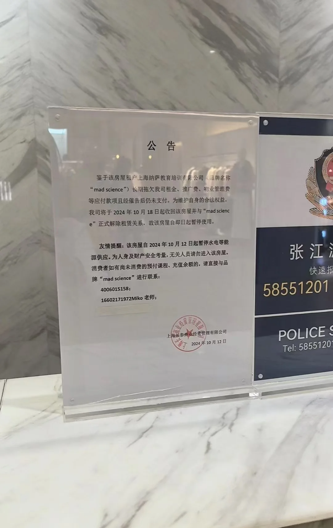 10月12日,长泰商业经营管理有限公司也曾发布公告称,“mad science”长期拖欠我司租金、推广费、物业管理费等应付款项且经催告后仍未支付。
