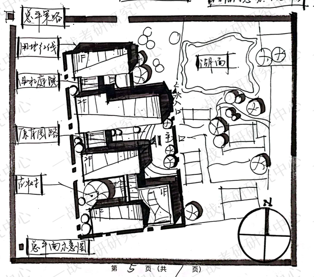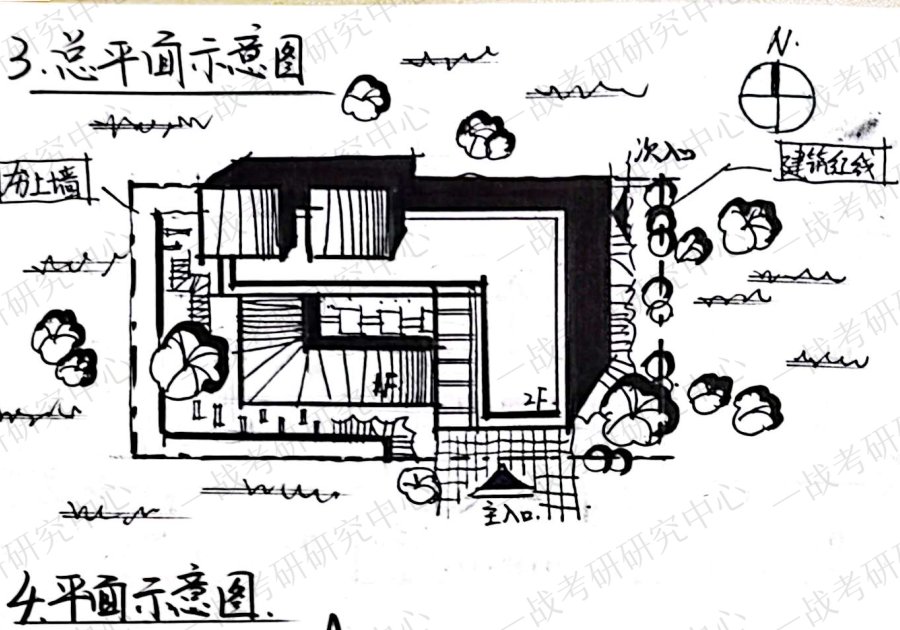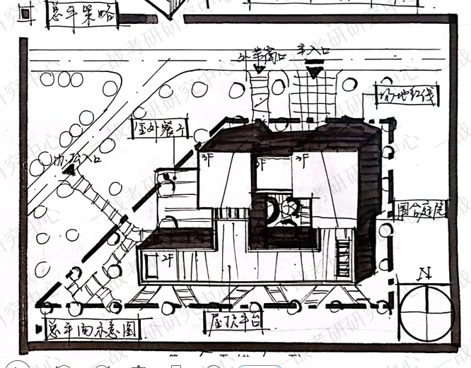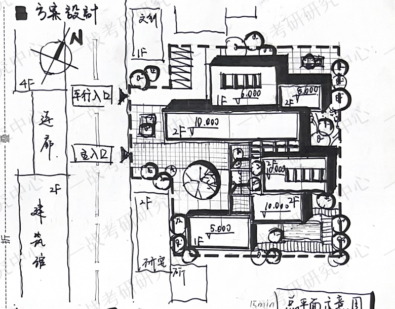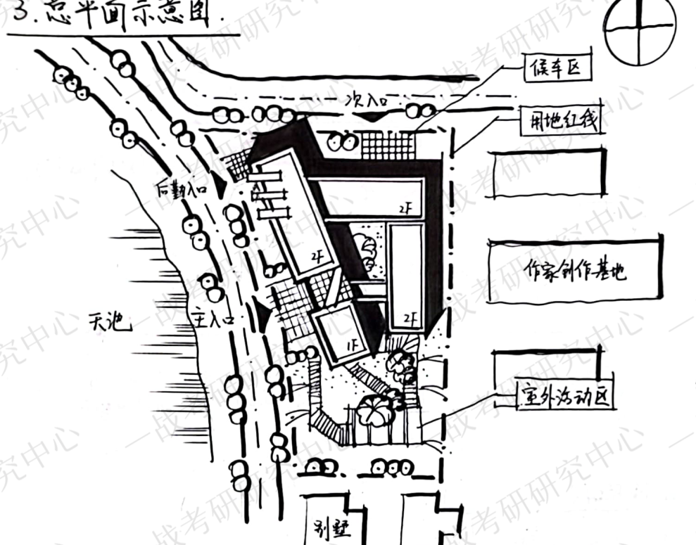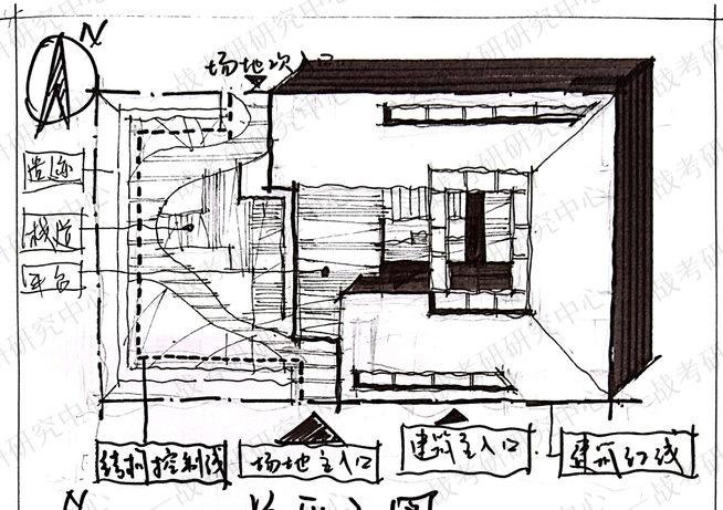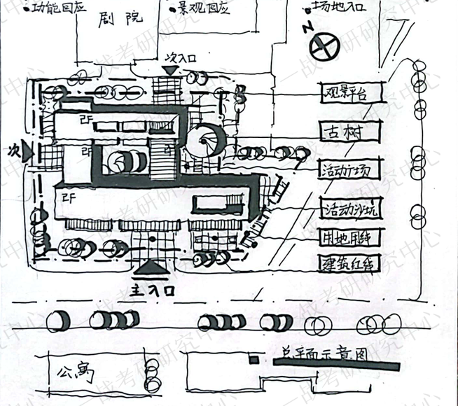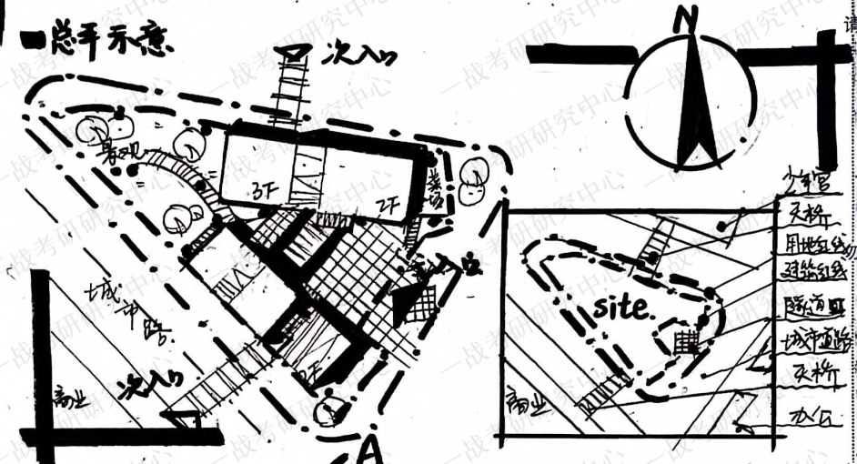 ③ 快题中的考点很多是在总平中设置的,总**映建筑对地形、景观、周边道路、周边建筑等场地条件的回应。