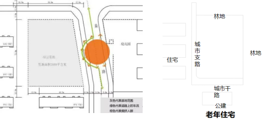 ② 公建项目建筑选“大路”,在迎向人流来向的位置设置场地入口,吸引外部人流来使用场地,增加场地的使用效率。