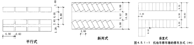 B.机动车停车场的停车方式:平行式,斜列式,垂直式(快题中最常用);