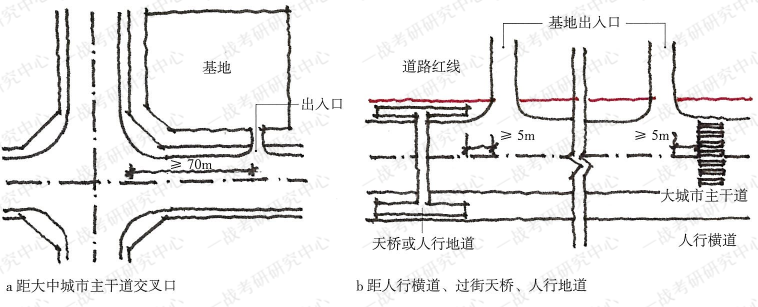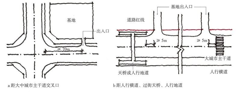 ③ 基地机动车入口:设在次干道,避免设置在主干道和商业步行街,建筑基地距离道路红线交叉口70m内不允许设车行入口。