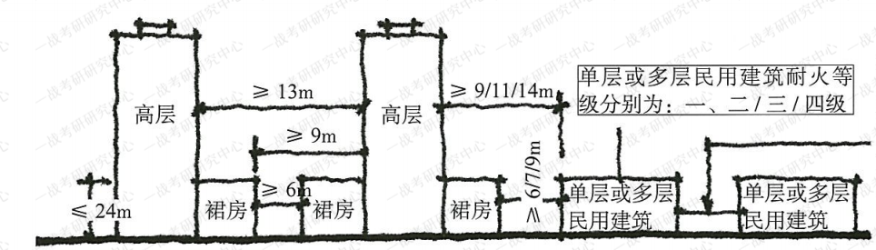 8、防火间距:是指相邻两栋建筑物之间,保持适应火灾扑救、人员安全疏散和降低火灾时热辐射的必要间距。我国规范要求多层建筑与多层建筑的防火间距不小于6米;高层建筑与多层建筑的防火间距不小于9米;高层建筑与高层建筑的防火间距不小于13米。