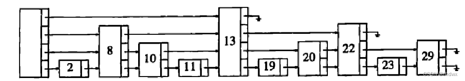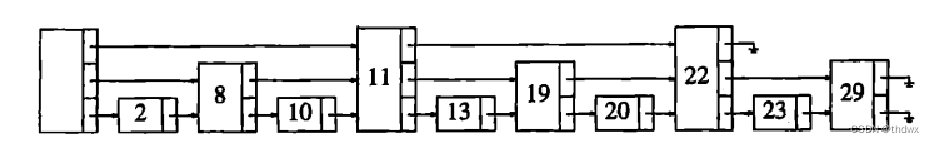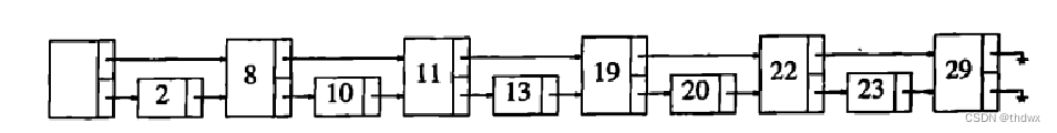 如果将上述链表再进行扩展,每隔3个节点,就有一个指针指向表中在它之后第4个位置的节点,这样的链表查找一次花费的时间就是