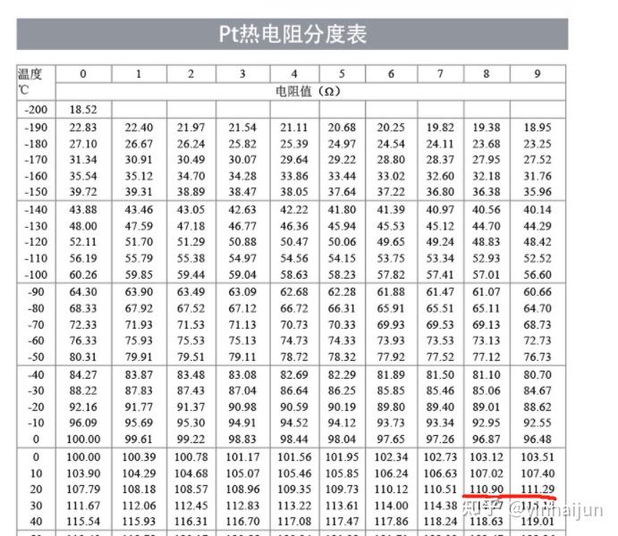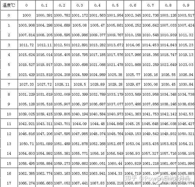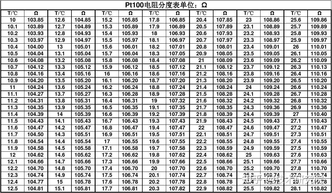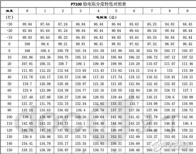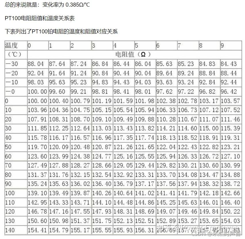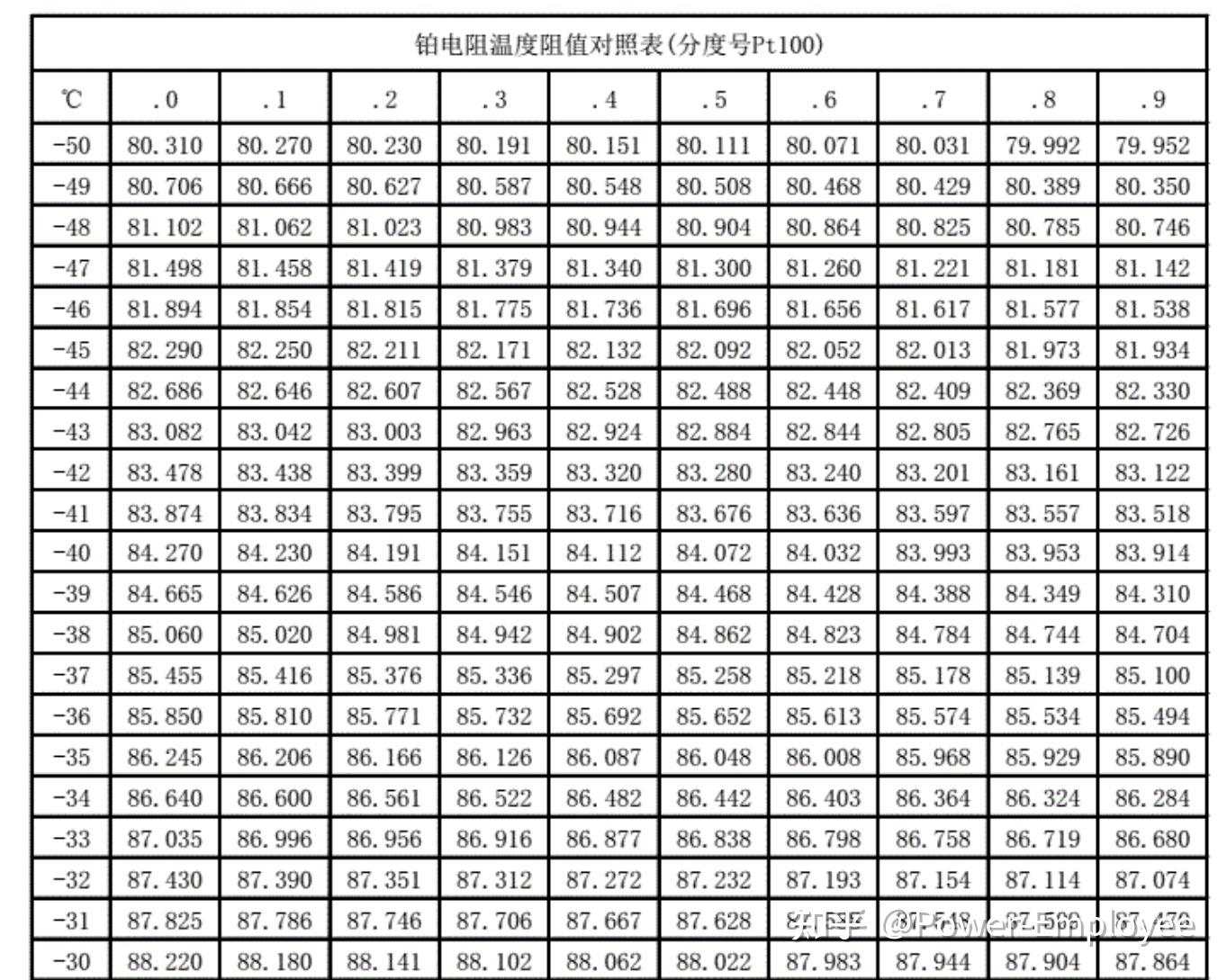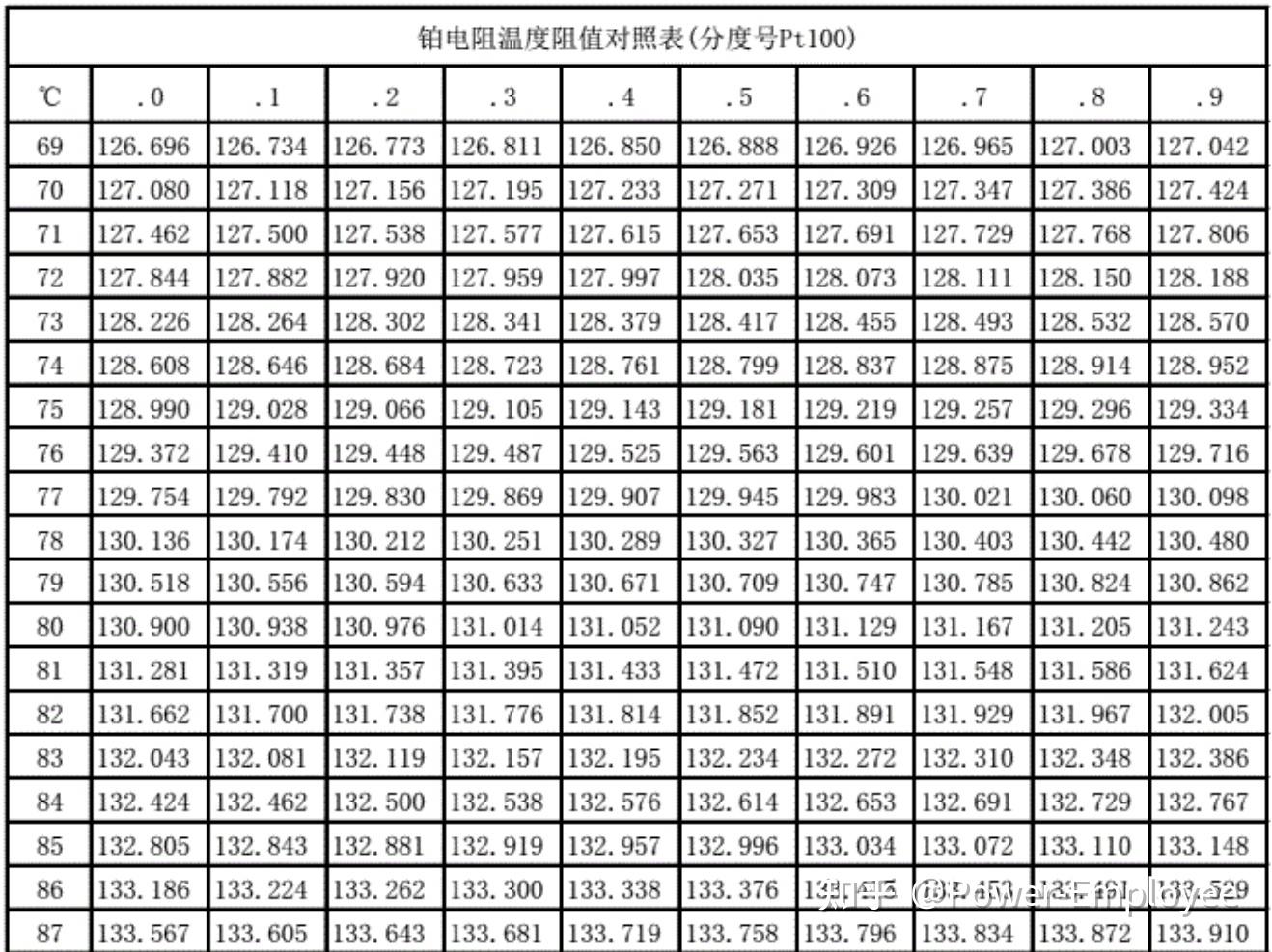 PT100如果知道了阻值,有2个办法可以知道此阻值下的温度。 一:通过计算得到阻值对应的温度,此方法过于复杂一般不推荐, 二:通过PT100的分度表查对应阻值即可知道温度。推荐的办法, PT100分度表如上图所示。