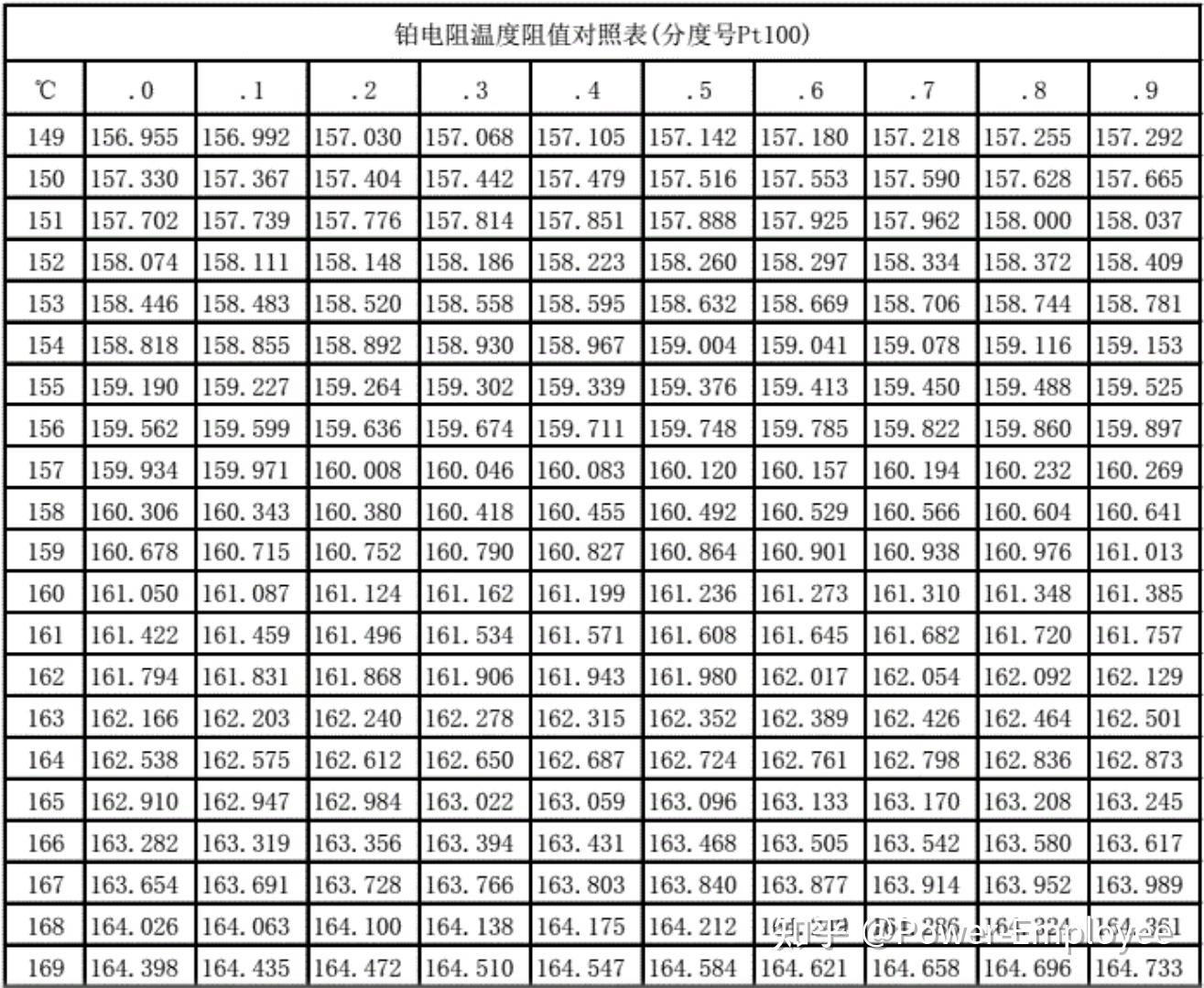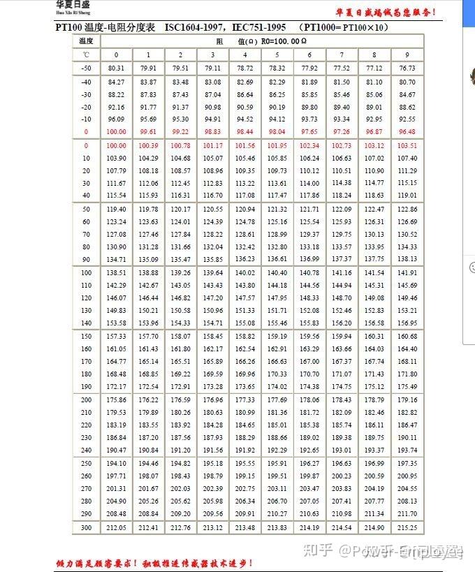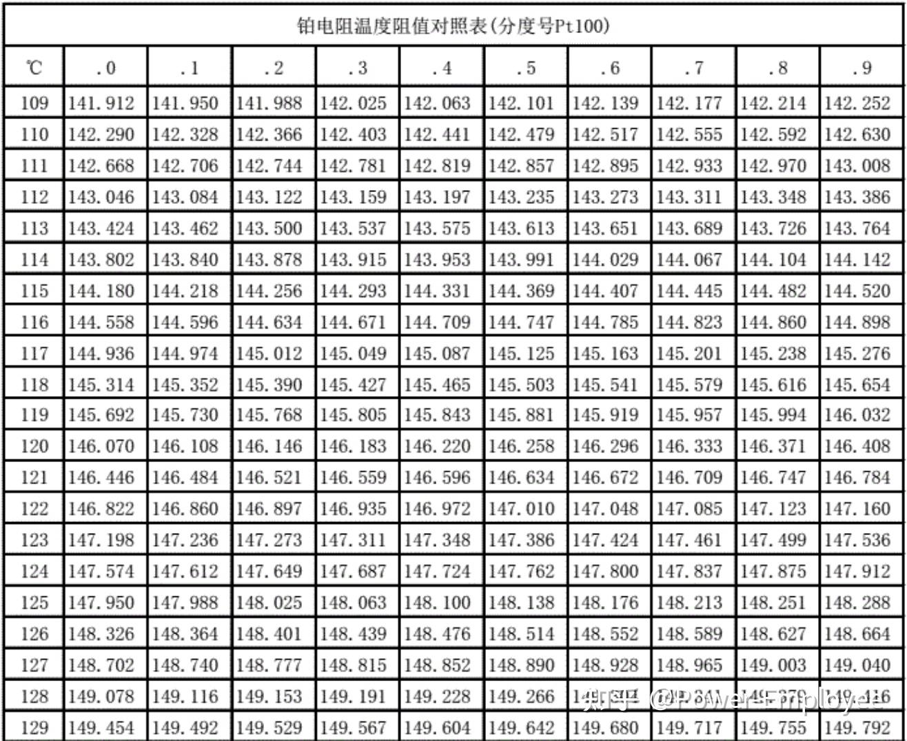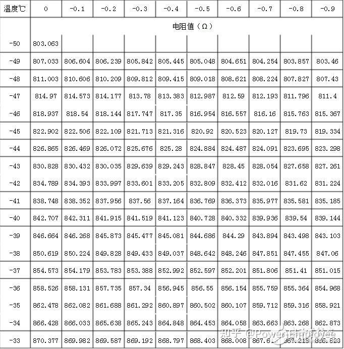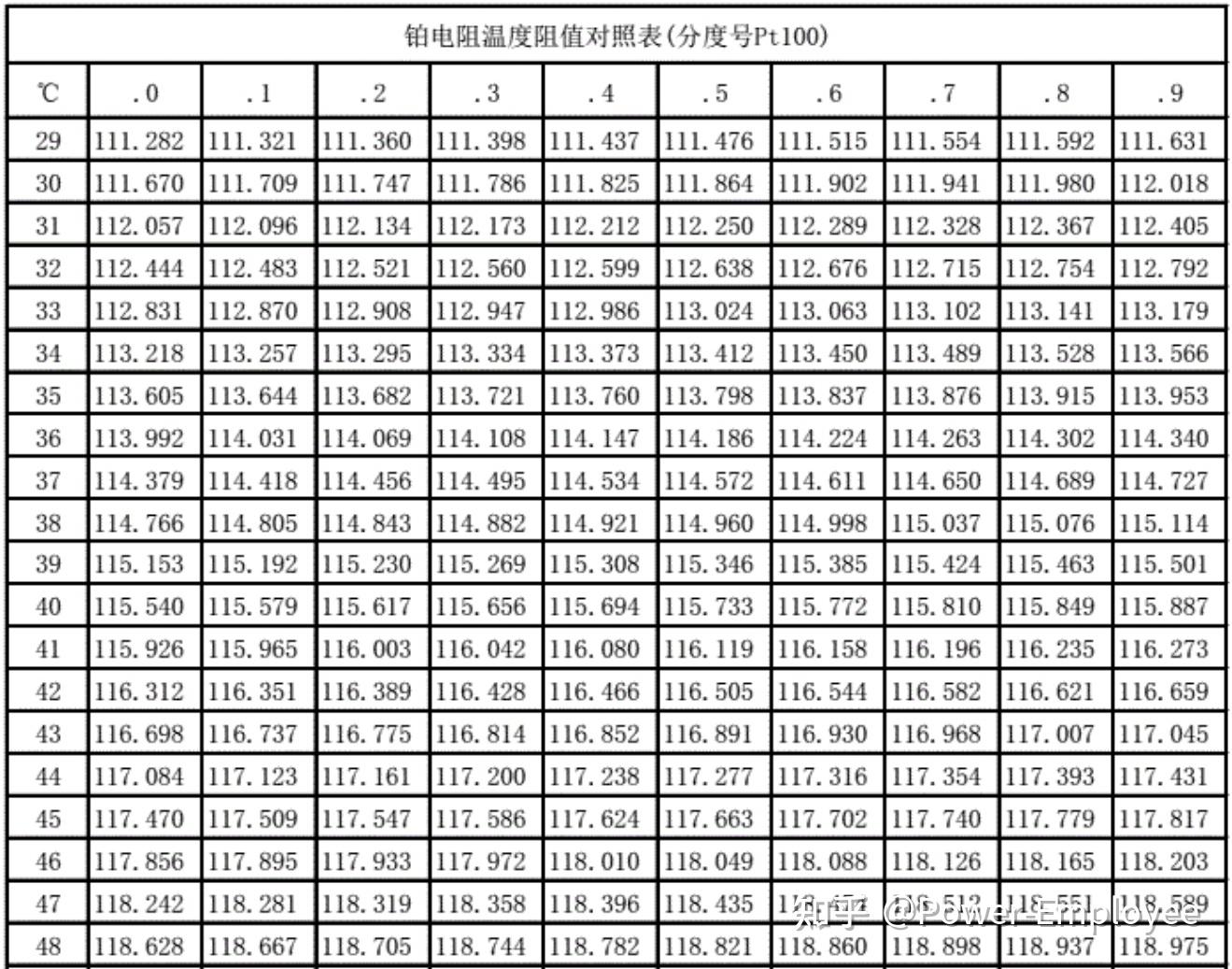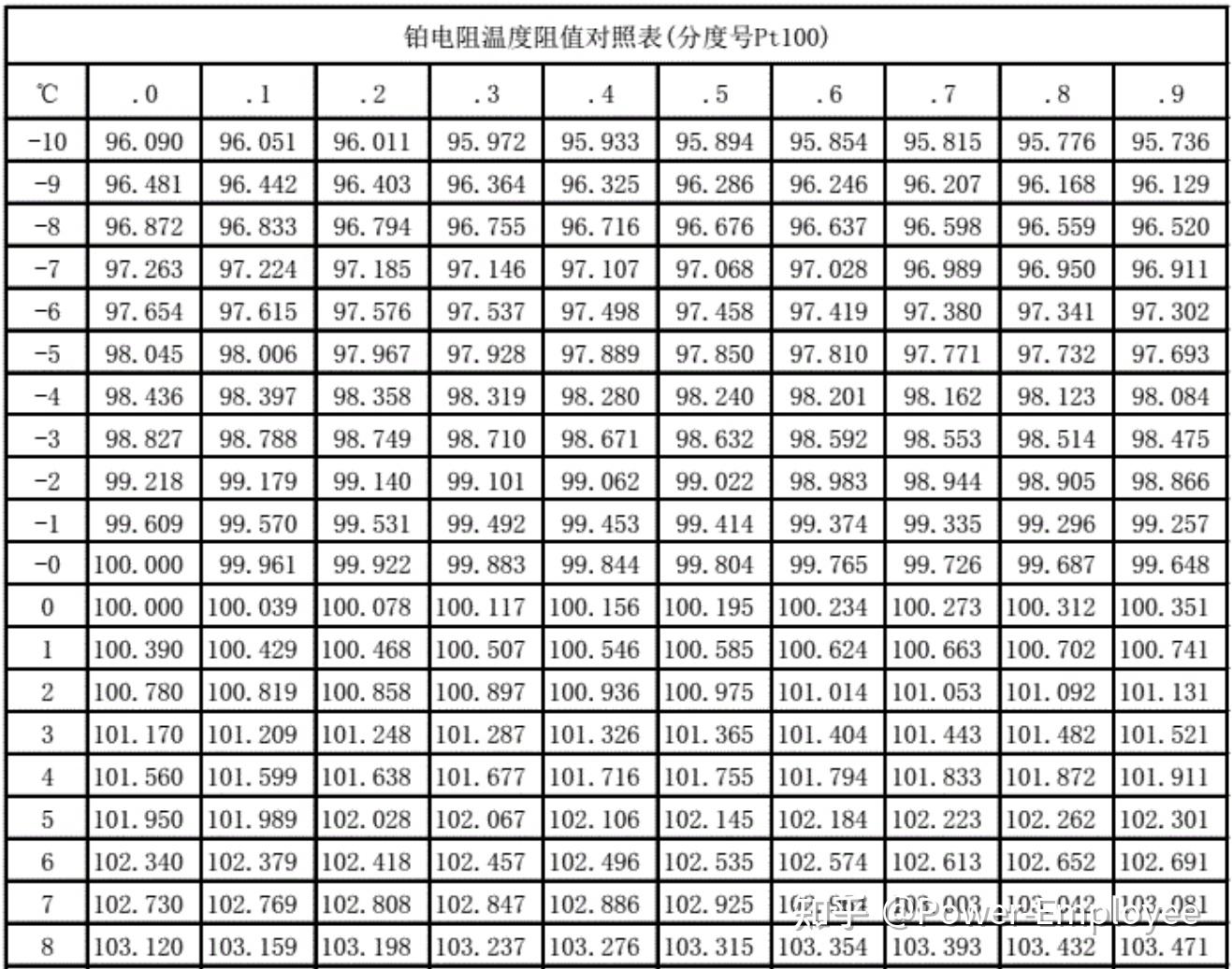PT100如果知道了阻值,有2个办法可以知道此阻值下的温度。 一:通过计算得到阻值对应的温度,此方法过于复杂一般不推荐, 二:通过PT100的分度表查对应阻值即可知道温度。推荐的办法, PT100分度表如上图所示。
