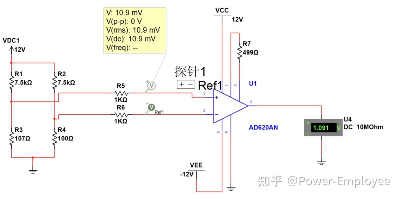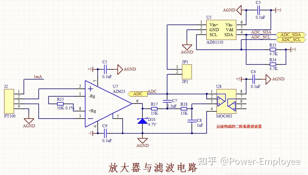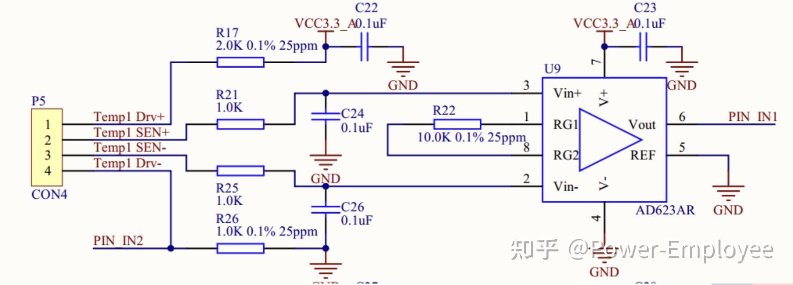 AD623是一个轨到轨的放大器,R22=10K,放大倍数为G=(1+100/10)=11倍;也就是Vpin_in1的测量值是PT100两端电压放大11倍后的值;