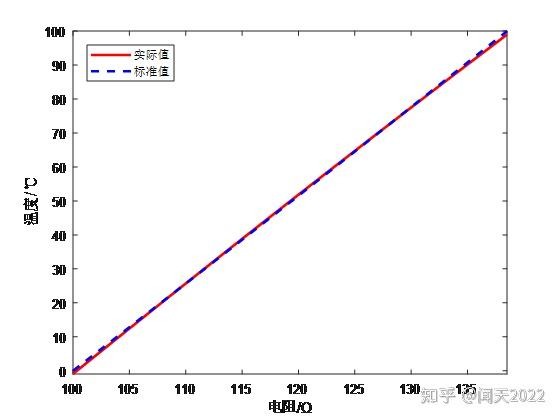 matlab代码 clear A=3.909e-3; B=-5.802e-7; R0=100; RW=.45; %% t=0:.1:100; Rt=R0*(1+A*t+B*t.^2)-RW; %% close all %% vcc=3.25; r1=999.6; r2=999.9; r3=100.2; r0=.32.5; pt=Rt; u=(vcc(pt + r0))https://www.zhihu.com/topic//(pt + 2*r0 + r1) - (r3*vcc)/(r2 + r3); T2=u*1000; %% DT=T2-t; T3=T2-DT(261); figure plot(pt,T2,‘r’,‘LineWidth’,2) hold on plot(pt,t,‘b–’,‘LineWidth’,2) ylabel(‘温度/℃’) xlabel(‘电阻/Ω’) legend(‘实际值’,‘标准值’) axis([pt(1),pt(end),-1,100]) 讯享网%% DT2=T3-t;
