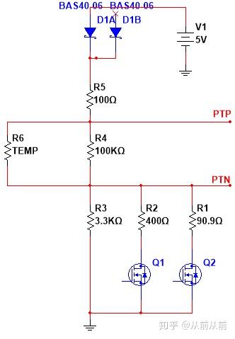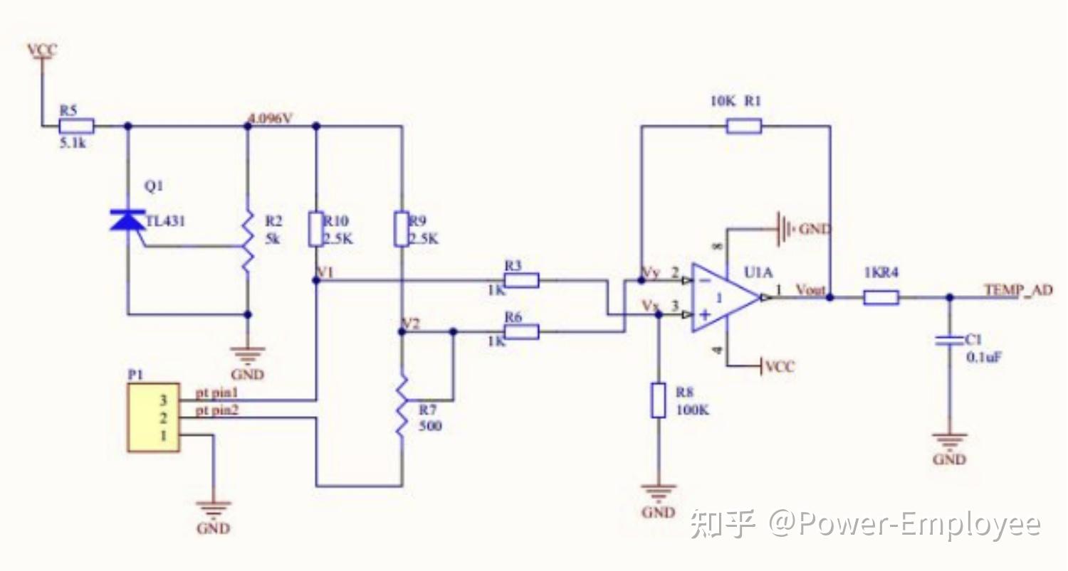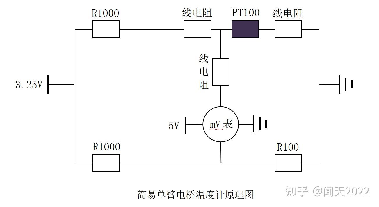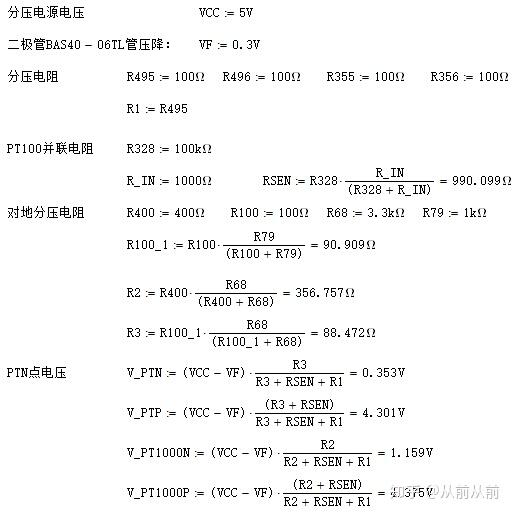 桥式电压采样电路,其原理是将V2作为参考电压,通过V1的变化去得到一个相对的电压数值,这样就能得到PT100的电阻数值,从而得到当前温度数值。