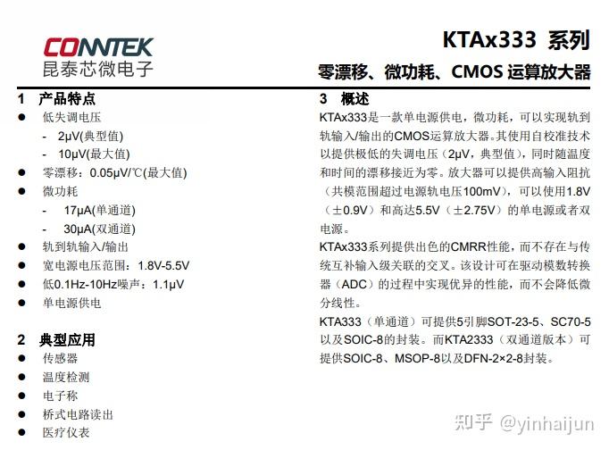 经运放 U1.2 差动放大后的信号经 R10、C4 进行低通滤波后送的 AD 转换器进行数字化测 量即可, 根据测出的 RT 值查 找PT100 分度表并经插值运算即可得到温度值。 为了提高测量精度,电路中运算放大器选用常用的KTA2333低噪声低温漂精密运算放大器。 它的输入失调电压小于 10μV,输入偏置电流±100pA,输入失调电压±120pV,失调电压漂移仅有 0.05μV/℃。