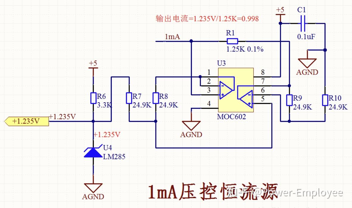 恒流源采用压控恒流源,电压基准采用LM285,输出电压1.235V。此恒流源的输出电流取决于LM285的输出电压,和R1的阻值,为了得到精确的输出电流,R1最好采用高精度,低温漂的电阻。如果需要更高的精度,则需要使用更高的电压基准芯片,比如REF5025,LM399等。