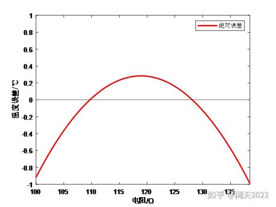 figure plot(t,DT2,‘r’,‘LineWidth’,2) hold on yline(0) ylabel(‘温度误差/℃’) xlabel(‘温度/℃’) legend(‘绝对误差’)
