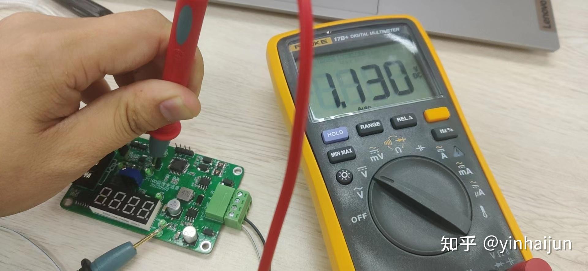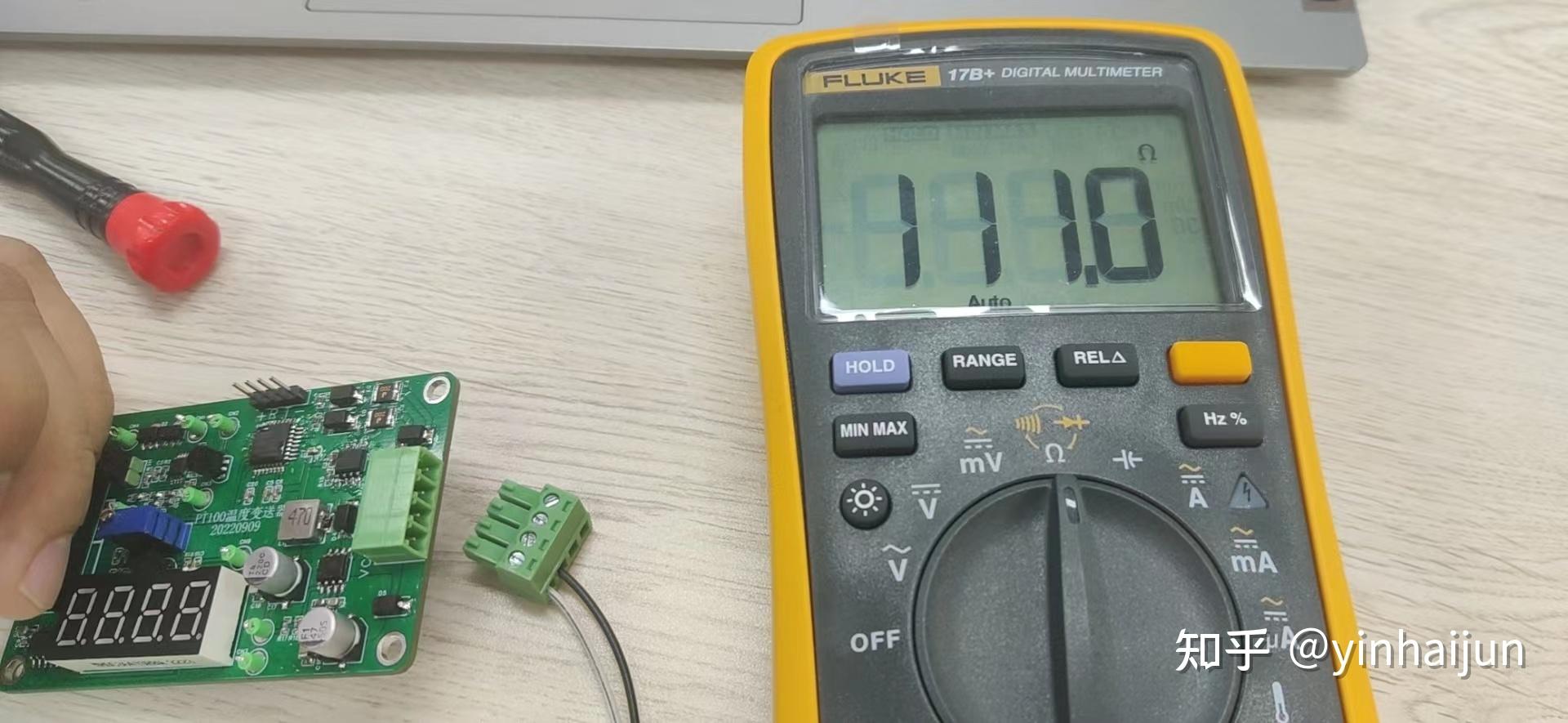 将PT100接到电路板上,测量经运放放大后的输出电压为1.13V,代入公式RT = Uo/11/I = (Uo * 2700 )/ (11 * 2.5) ,算出电阻值为110.9R。